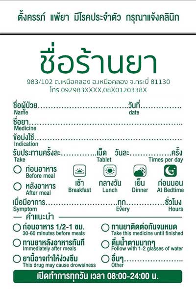 สติ๊กเกอร์ติดซองยารายละเอียดครบถ้วนตามมาตรฐาน GPP เนื้อสติ๊กเกอร์ซองยาใช้ปากกาเขียนติดง่าย และกาวติดแน่นไม่หลุดง่าย ระยะเวลาผลิต 15 วัน
